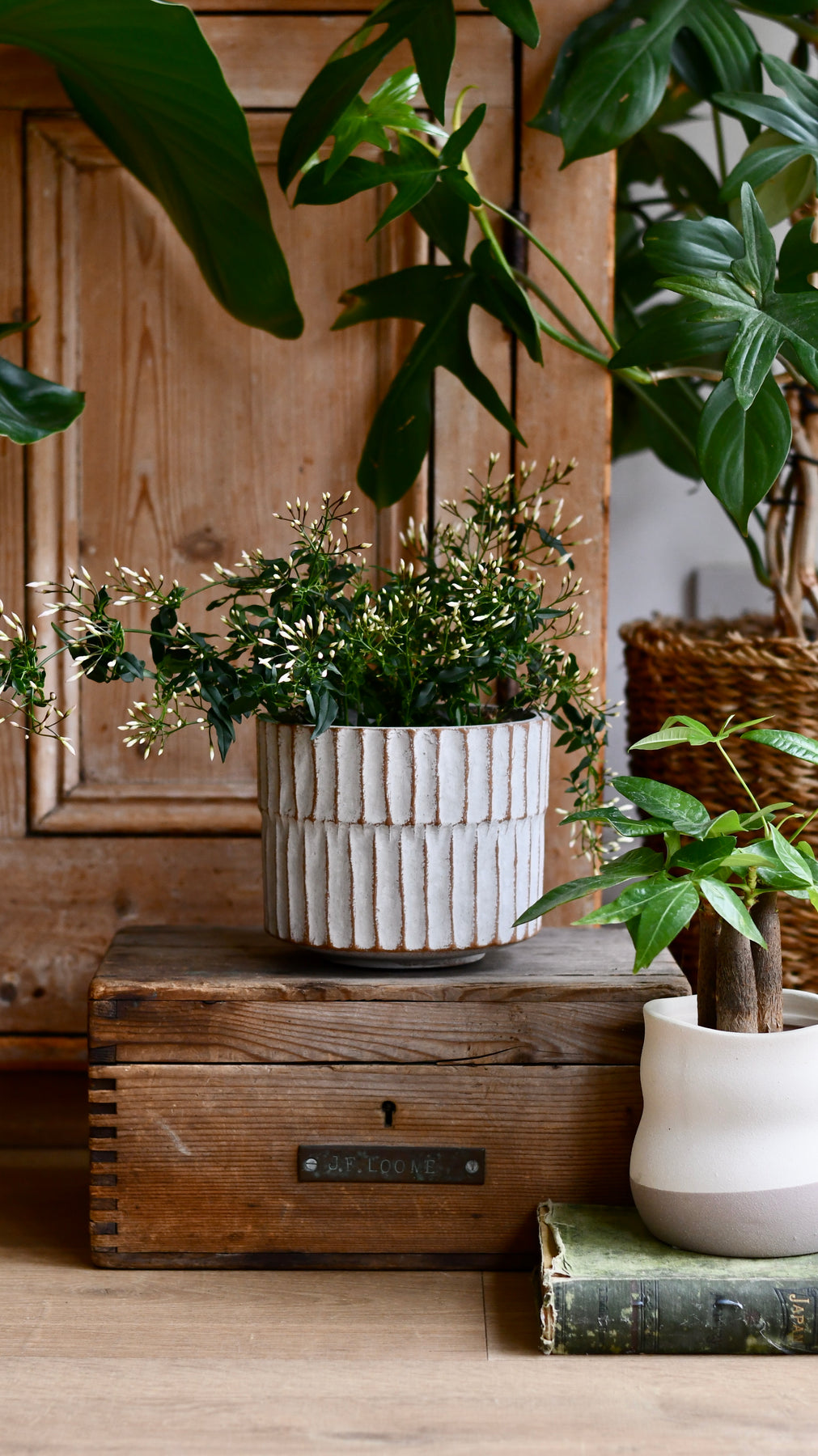 This is a pot designed to feel effortless. The textured surface catches light gently and adds depth without feeling busy, making it easy to style on shelves, sideboards, desks, or windowsills. The neutral finish works particularly well with green foliage, helping plants look fresh and grounded rather than overly styled.