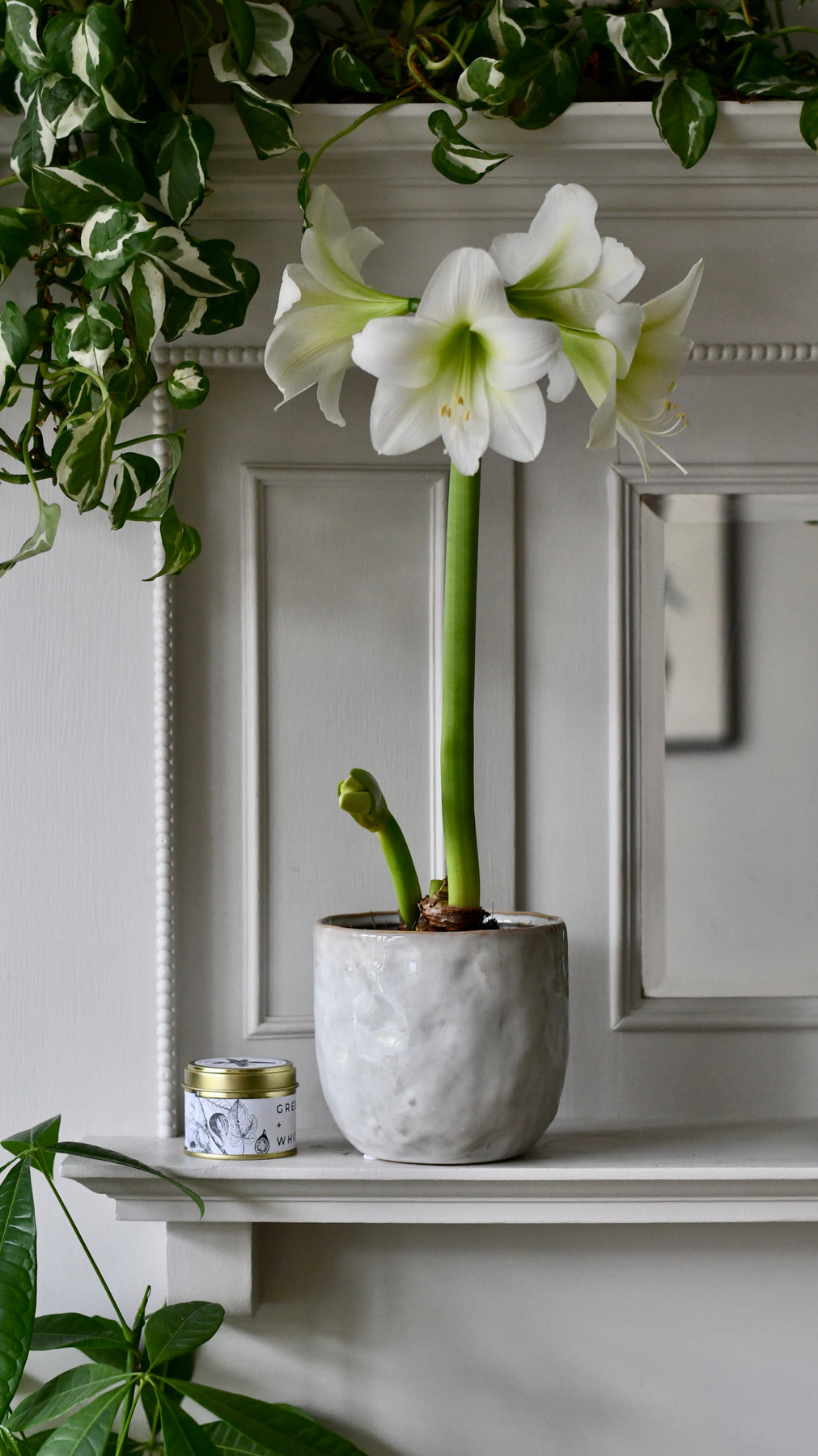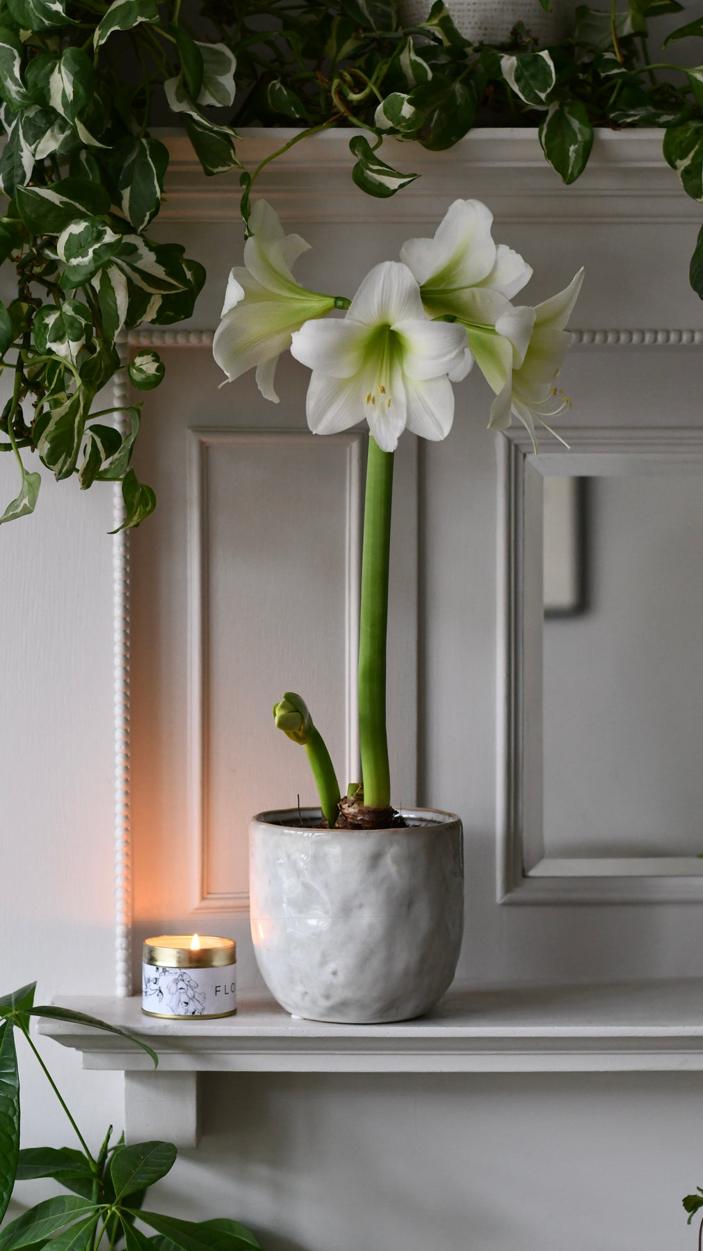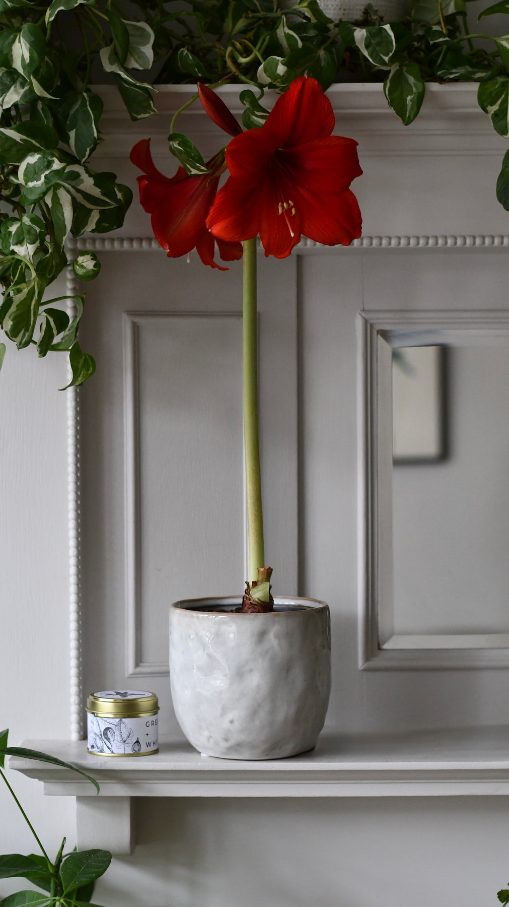 Red Amaryllis adds warmth and bold winter colour to living rooms, mantles, dining tables or hallways. White brings a soft, serene glow that suits Scandinavian, minimalist and contemporary spaces. Paired with the candle, the set creates a peaceful, welcoming corner in any home.