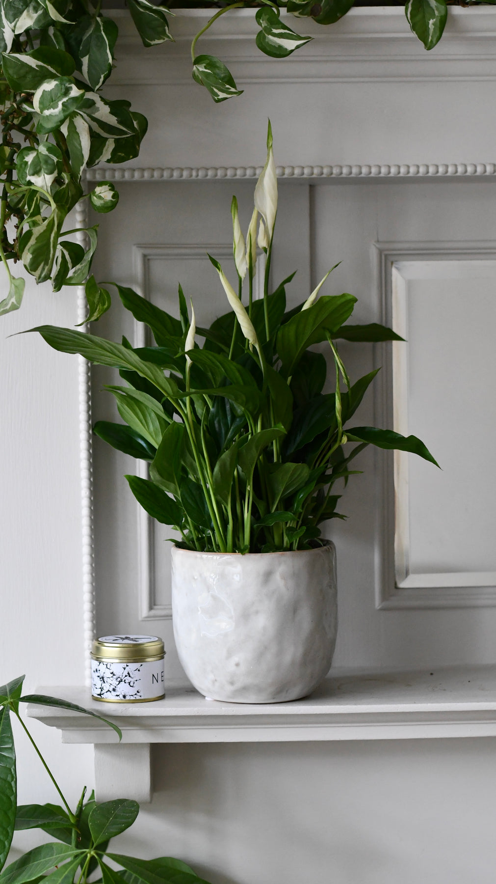Keep in bright, indirect light. Water when the surface of the compost feels dry; the leaves will gently droop to remind you if it needs a drink. Peace Lilies enjoy consistent moisture but dislike sitting in water. Avoid cold draughts in winter.