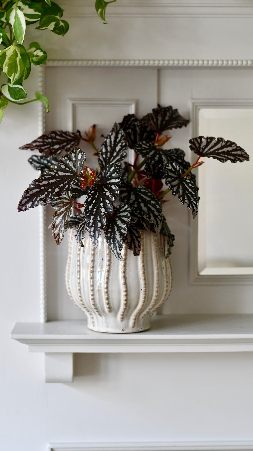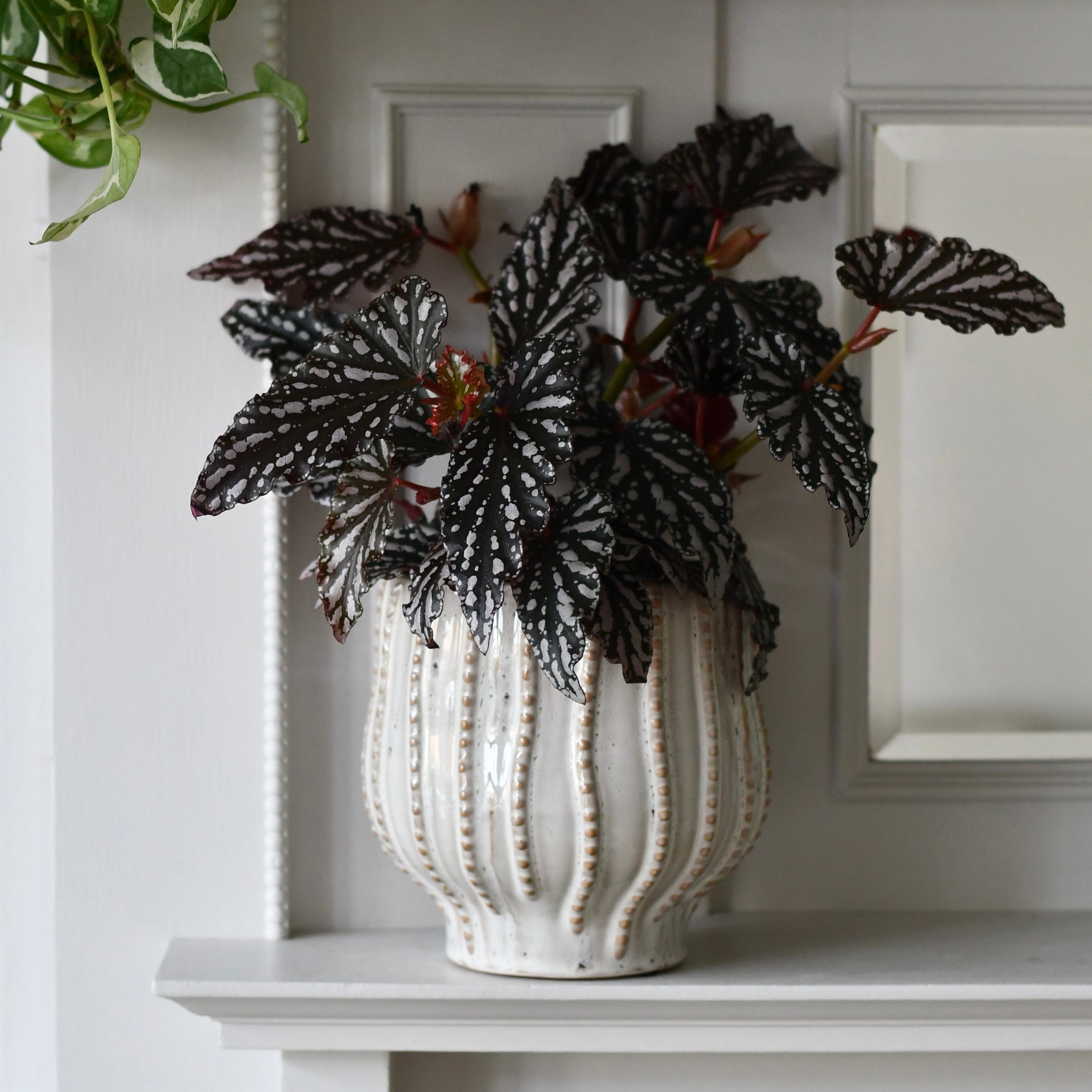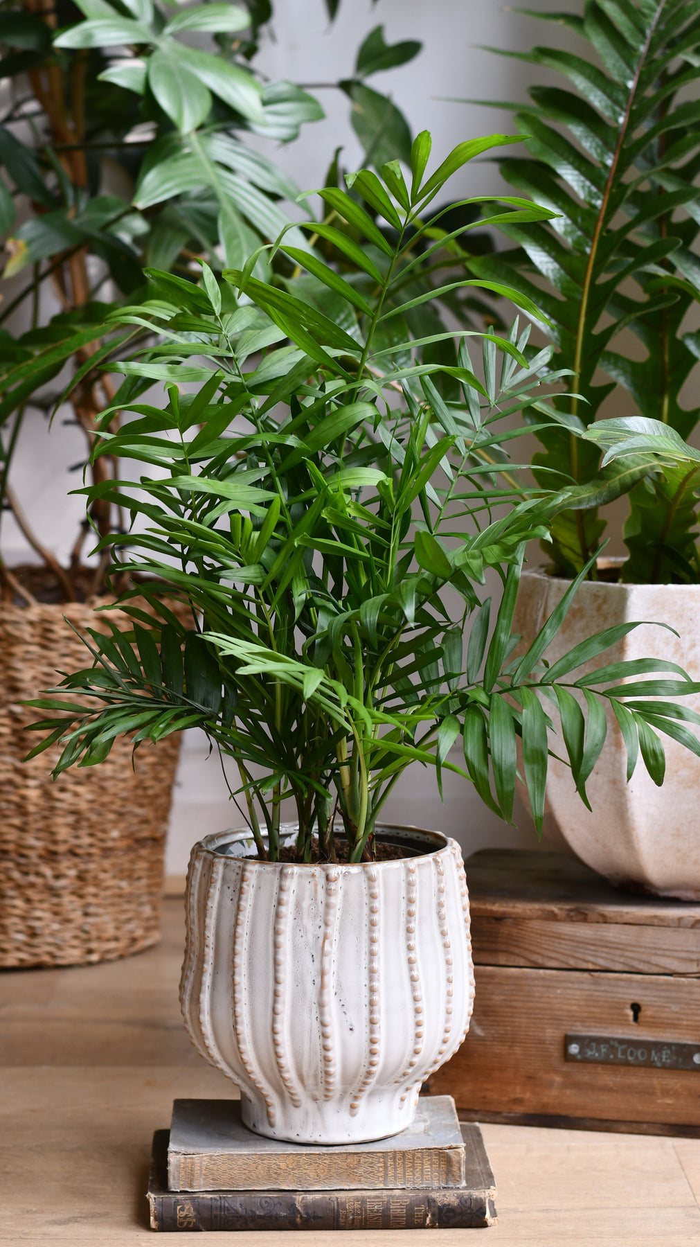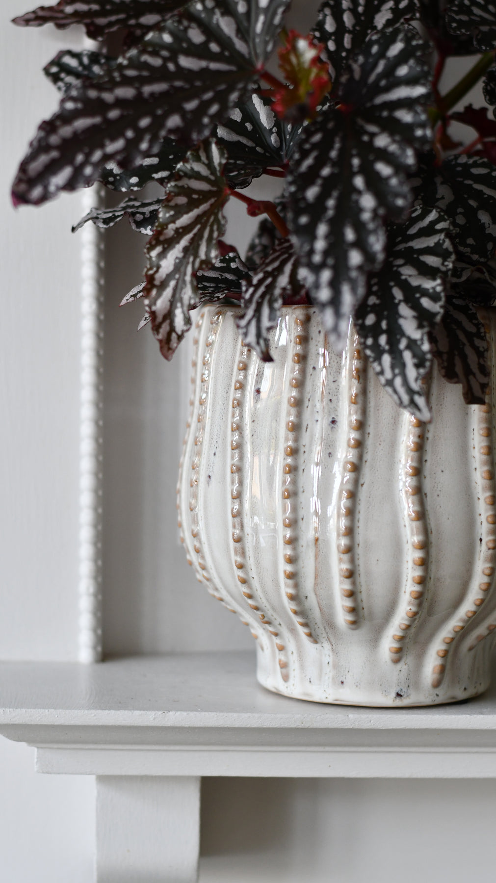 Finished in a glossy, pale oatmeal glaze with subtle speckles and tactile vertical ridges, each pot has a hand-crafted feel that celebrates texture and form. The gently fluted shape sits proudly on a small pedestal base, elevating your plant and lending a sculptural quality to your styling.